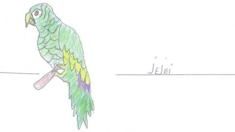 [Español]: "Es orgulloso, su alimentación es fruta de samuu (Chorisia insignis) y otra fruta más que le gusta. Es (era) una chica linda pero siempre le gusta cantar."